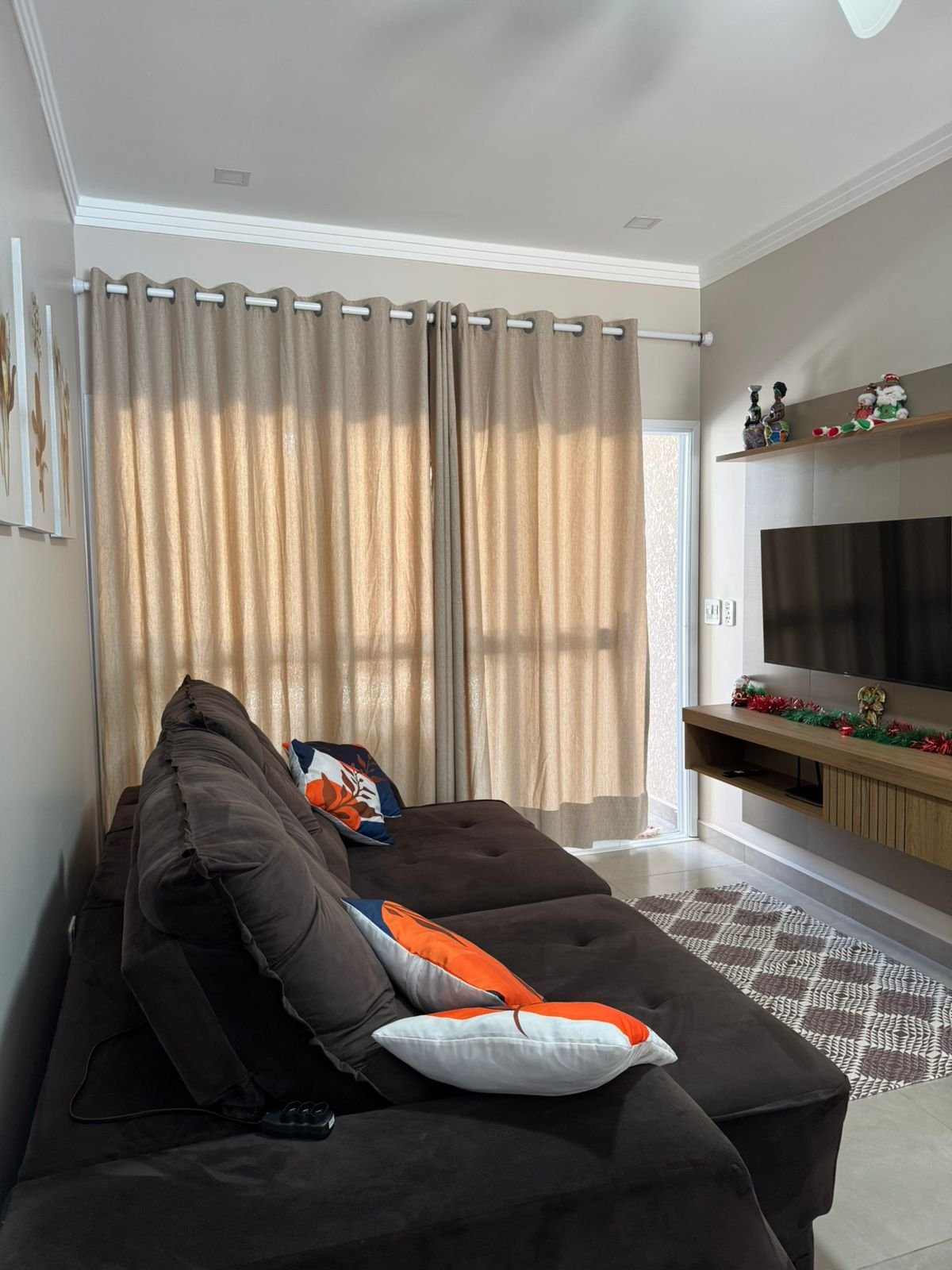 Uma sala compacta e aconchegante, perfeita para momentos de descanso. O sofá-cama garante praticidade e mais espaço para receber.